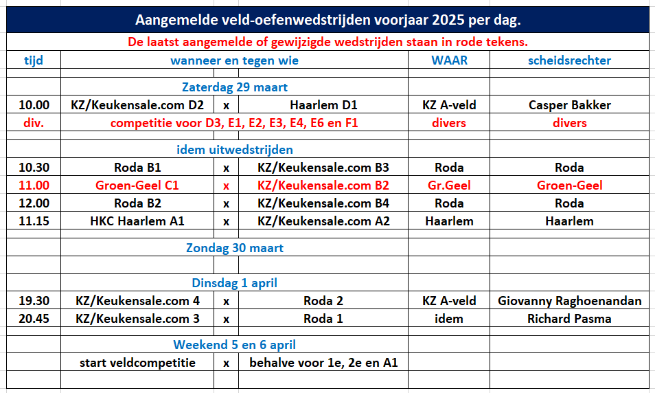 Momenteel wordt er druk overlegd met tegenstanders over verplaatsing, dus check vooral regelmatig of jouw wedstrijd er nog steeds op staat. Van KZ 3 is een wedstrijd tegen Groen-Geel 3 naar een andere datum verplaatst, omdat het de tegenpartij anders toch niet schikte. Let ook even op de omzetting van het 6e/7e, dus het is nu KZ 7 dat gaat oefenen. En er zijn nog wat nieuwe wedstrijden bijgekomen (in rood). Vast staat ook nog, dat de oefenwedstrijd van F1 bij KVA vervalt, omdat F1 al voor de competitie aan de slag moet.