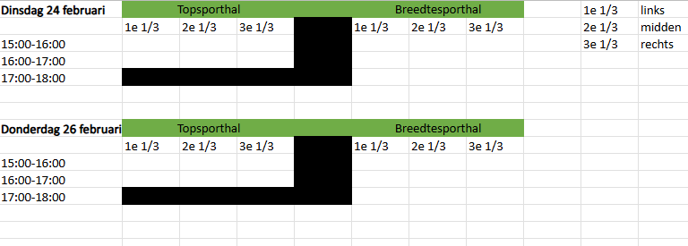 De trainers kunnen, in overleg met Mirelle en elkaar, kijken op welk tijdstip ze eventueel willen trainen. In het schema hieronder kan je dit dan bijhouden.